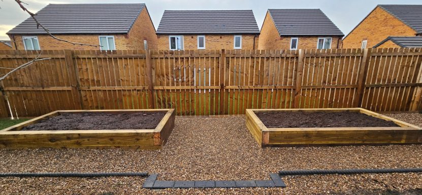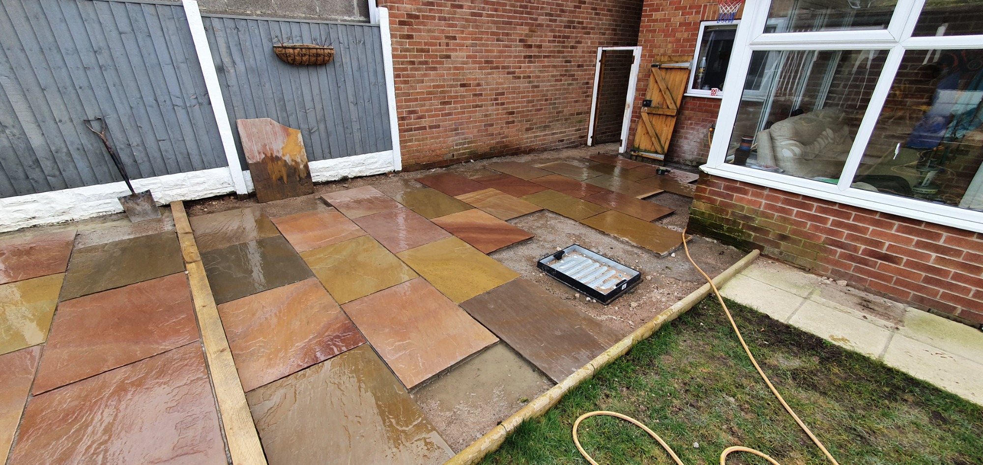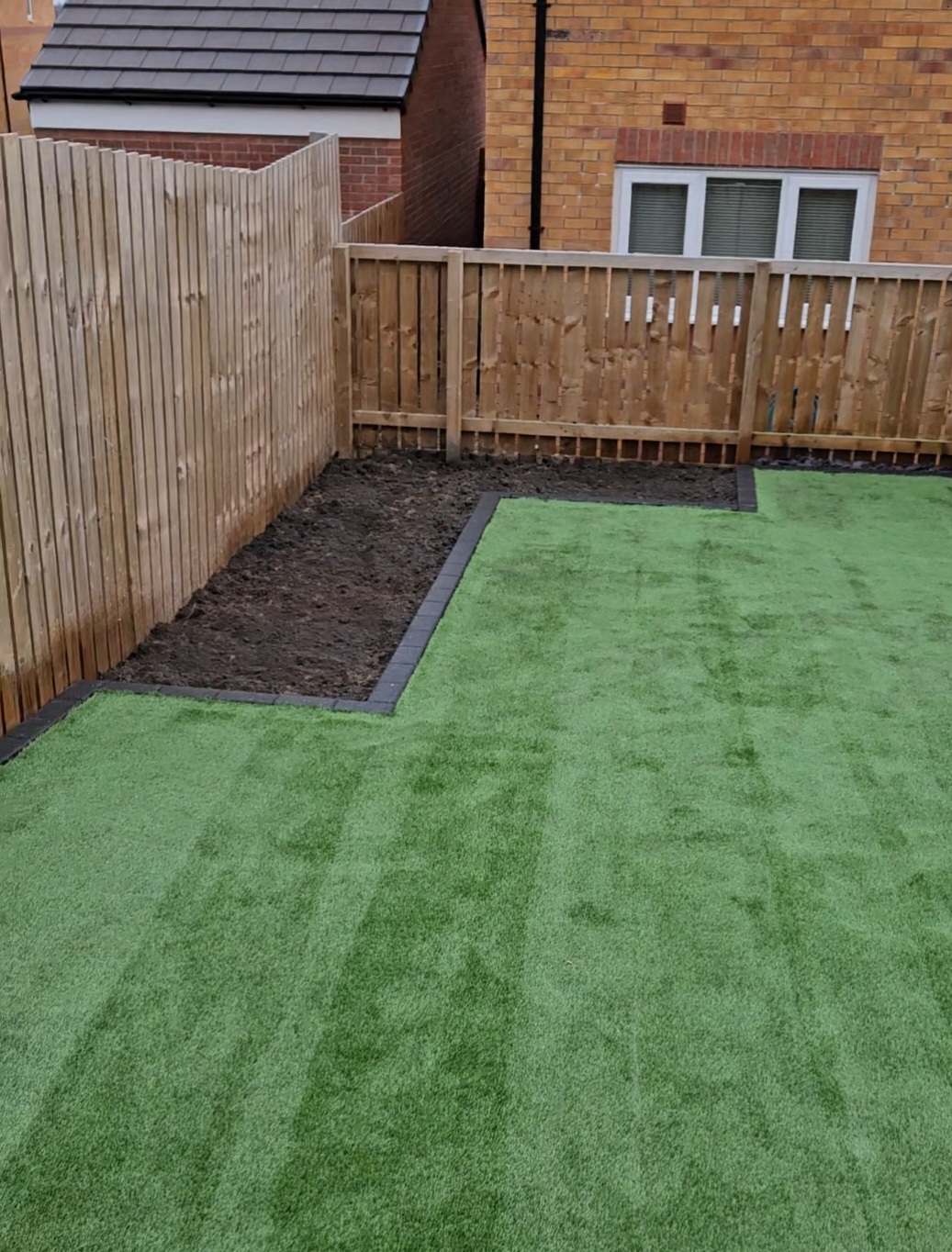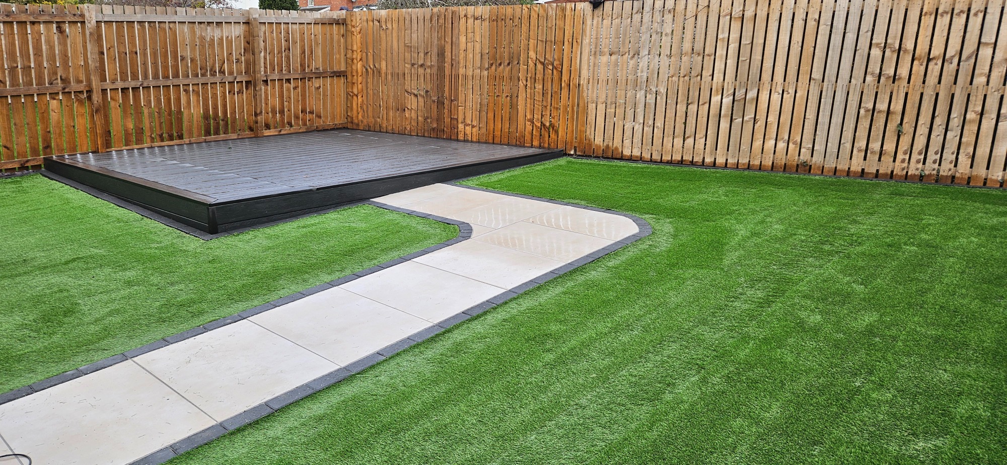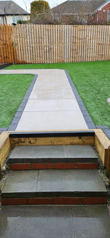 Here we have a new build garden re-design. Garden levelled, porcelain paving laid with new premium turf