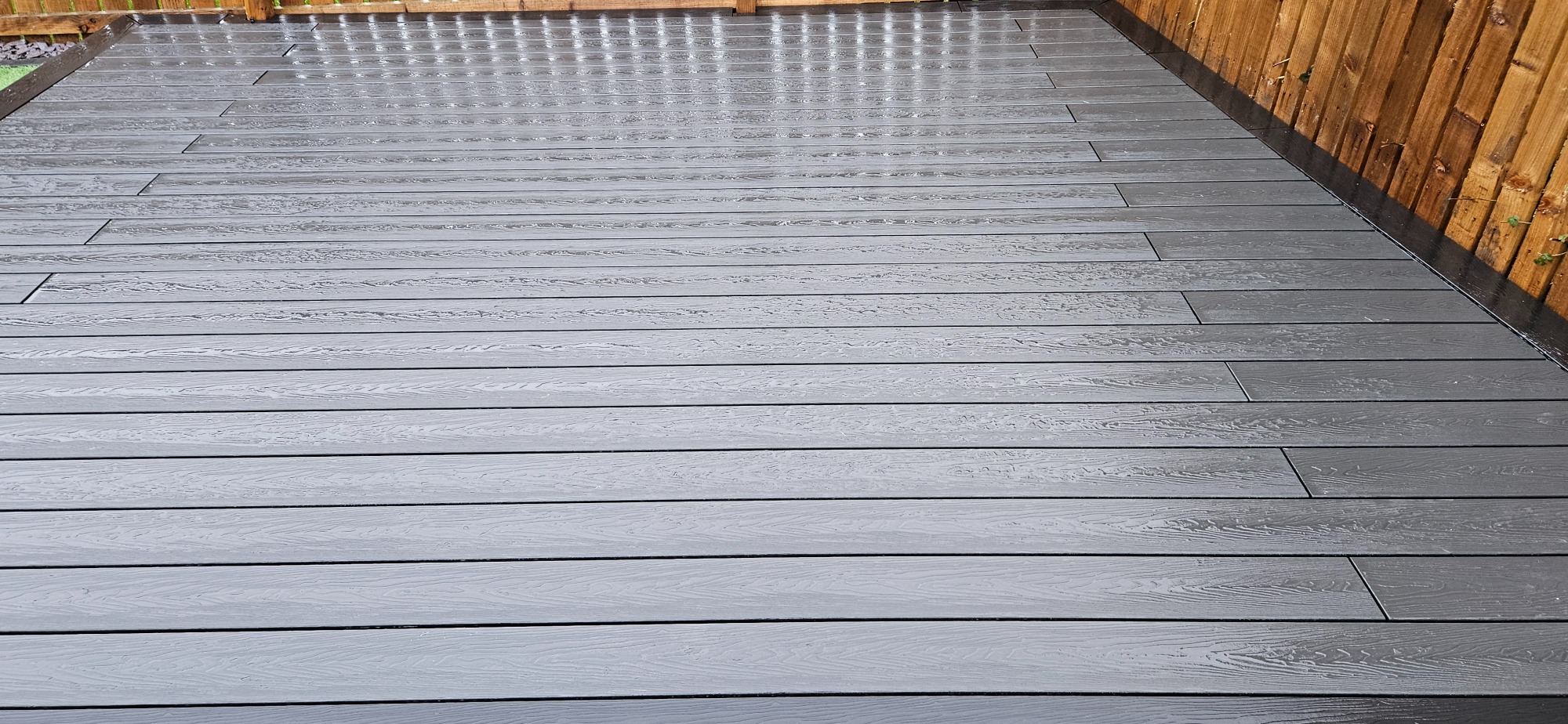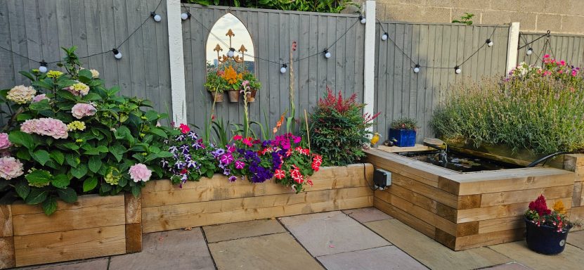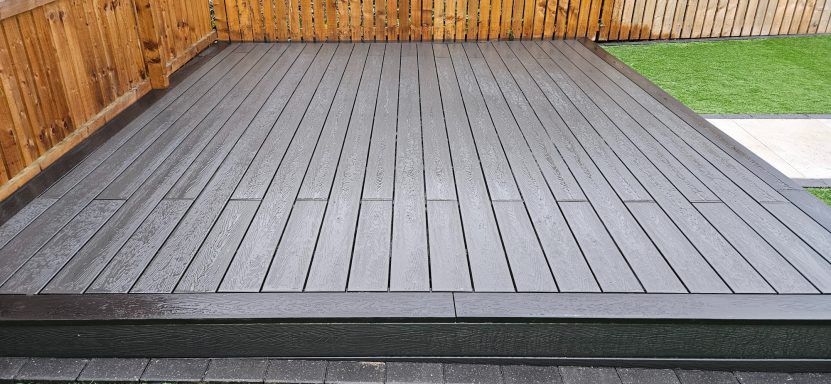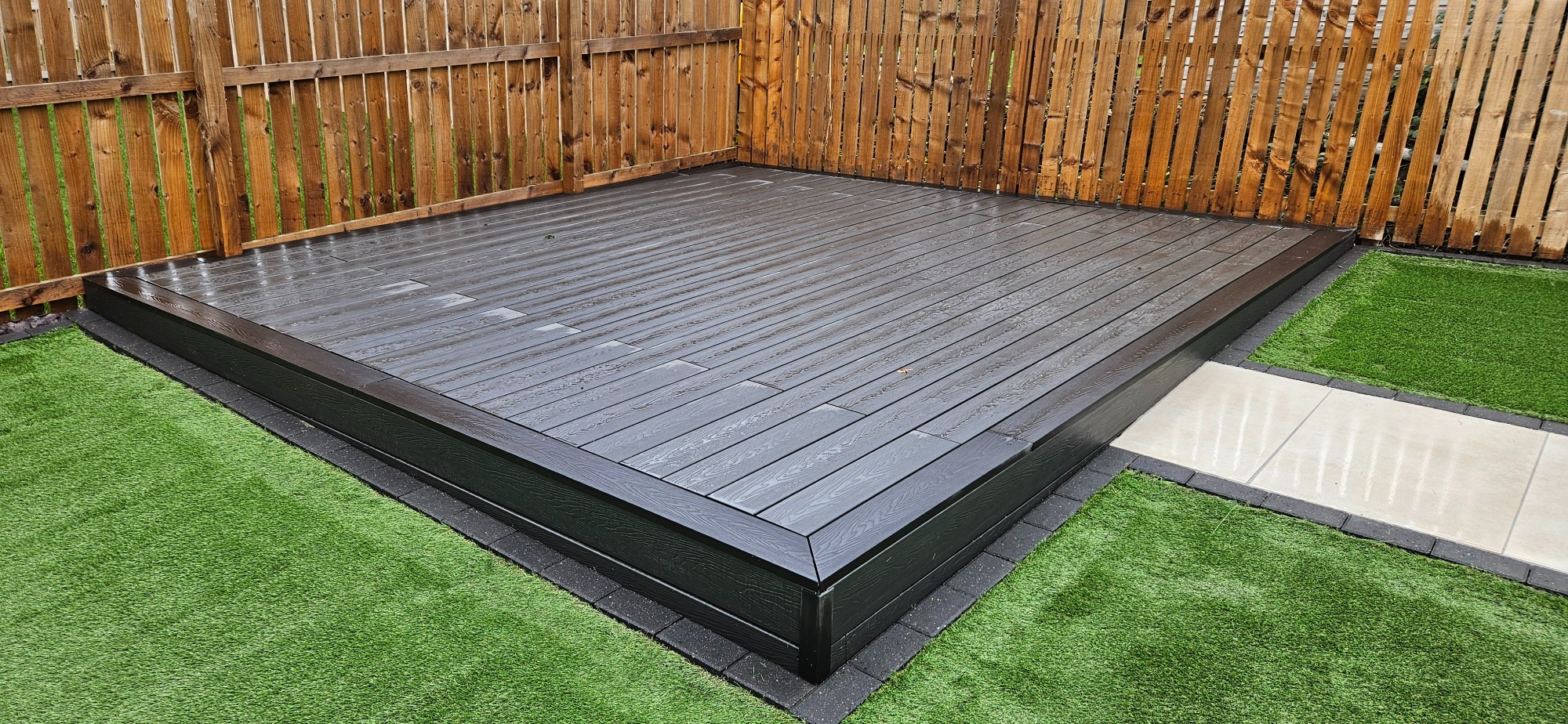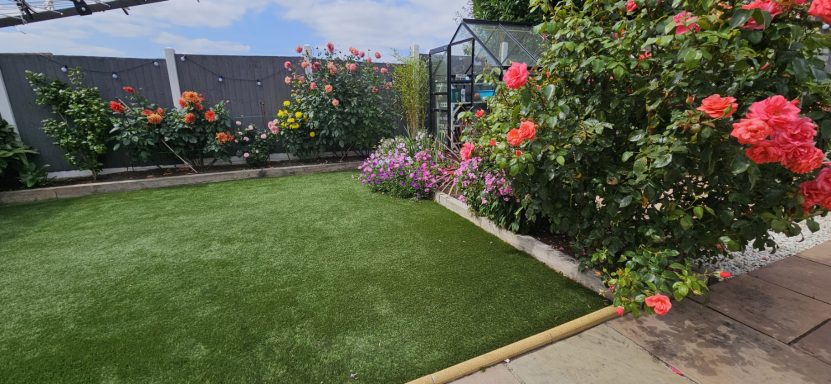 This garden was transformed to a low budget. Consisting of, Porcelain patio, and artificial grass, boarded with black ice stone